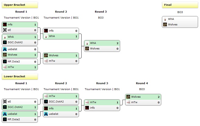 We haz Asian lost the finals of the german national WCG qualifier two days ago to uebelst but manages to pull off a better run in this stand-alone tournament. They went through Winner Bracket without dropping a single map. Their fellow countrymen in uebelst didn't quite repeat the earlier success from the qualifiers and got eliminated today by Infused. For the second time in this event, Wolves took out The International-atendee mTw, and mTw will have to settle with third place this time around.