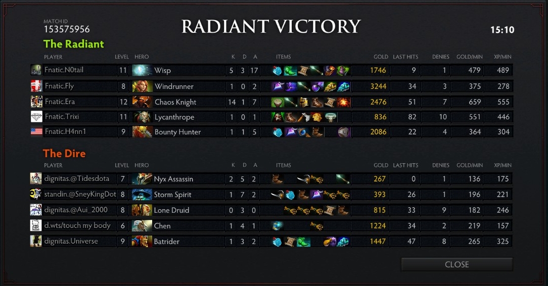 Dignitas's continuous sloppy play in the laning phase gave Chaos Knight and Wisp a combined total of seven kills in just mere five minutes. Dignitas attempted a counter-gank on the Wisp and Chaos Knight but ended up dying more. The score was up to 14-2 in 8 minutes with the duo having a hand in all the kills.
