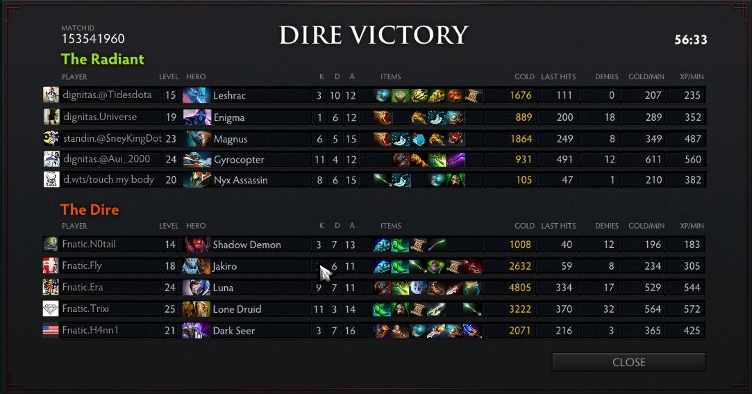 Game one started with Fnatic.EU playing the offensive trilane with Luna, Shadow Demon, and Jakiro against Dignitas much inferior trilane of Gyrocopter, Nyx Assassin, and Leshrac. Due to the tremendous pressure put on by Fnatic.EU, Leshrac left the lane and started stacking the jungle camps. Leshrac had no experience gain by 6 minutes.