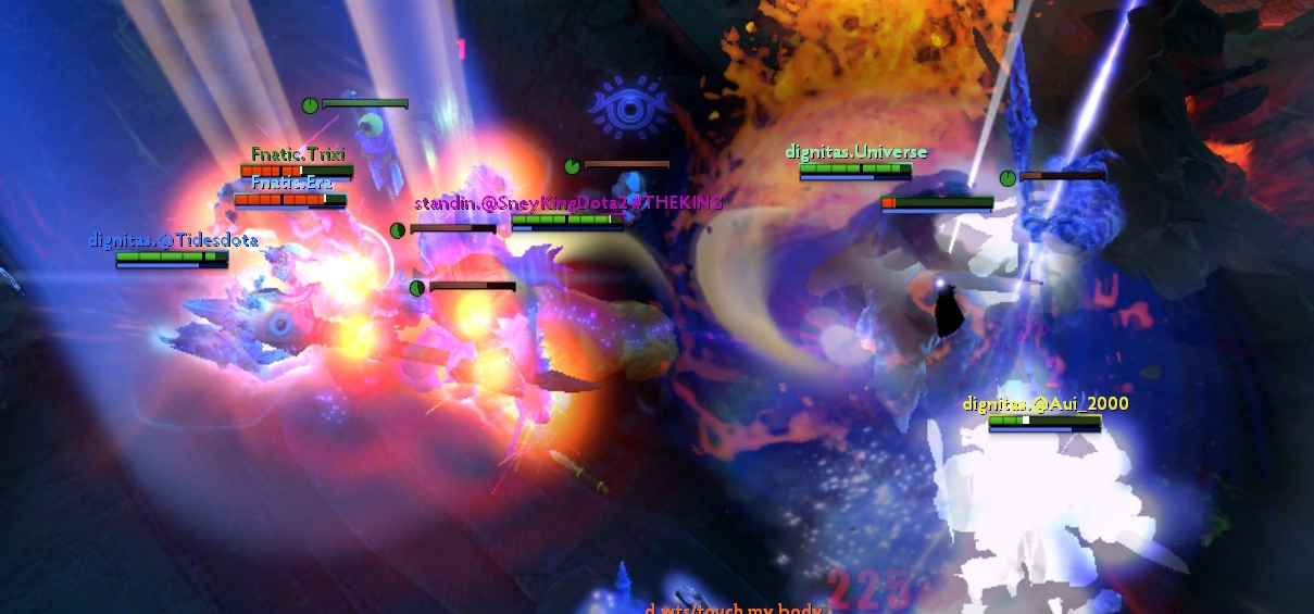 As Dignitas attempted to go up Fnatic's high ground, their AOE combo did not chain off properly and they lost the fight and the Roshan.