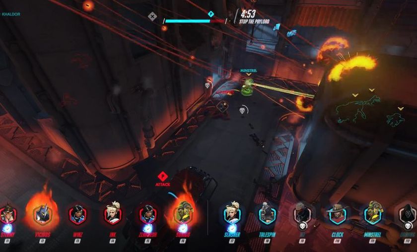 For starters, the bottom of the screen is filled with an overview of both teams. This overview provides an easy reference to see what heroes are currently being played, which players are dead or which have access to the Ultimate Ability. Secondly, Khaldor showcases both the POV of a floating cam as well as the ability to jump onto any character's shoulder to watch the action from closer range.