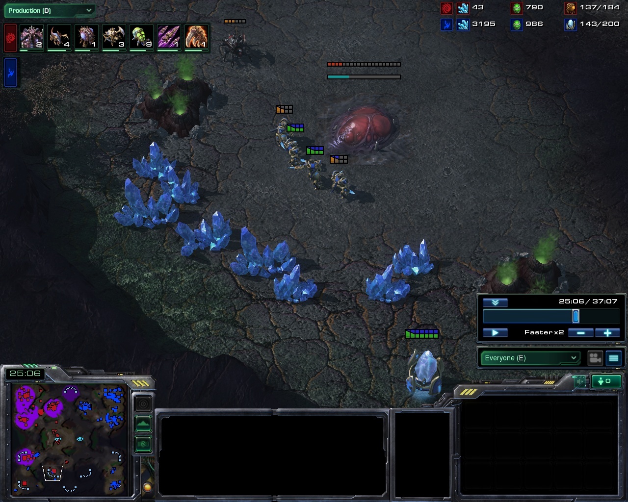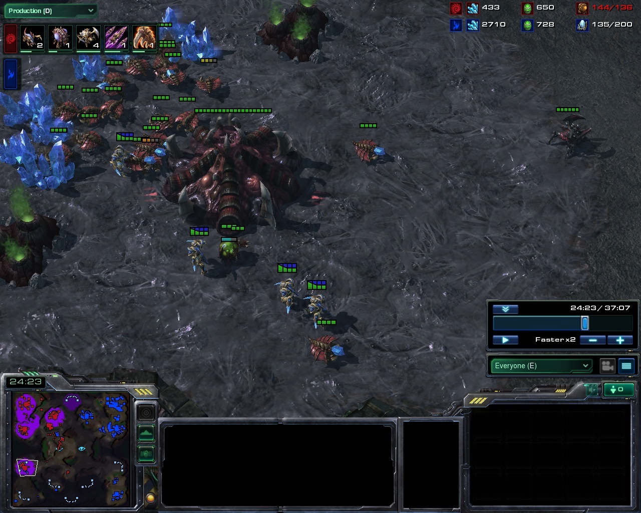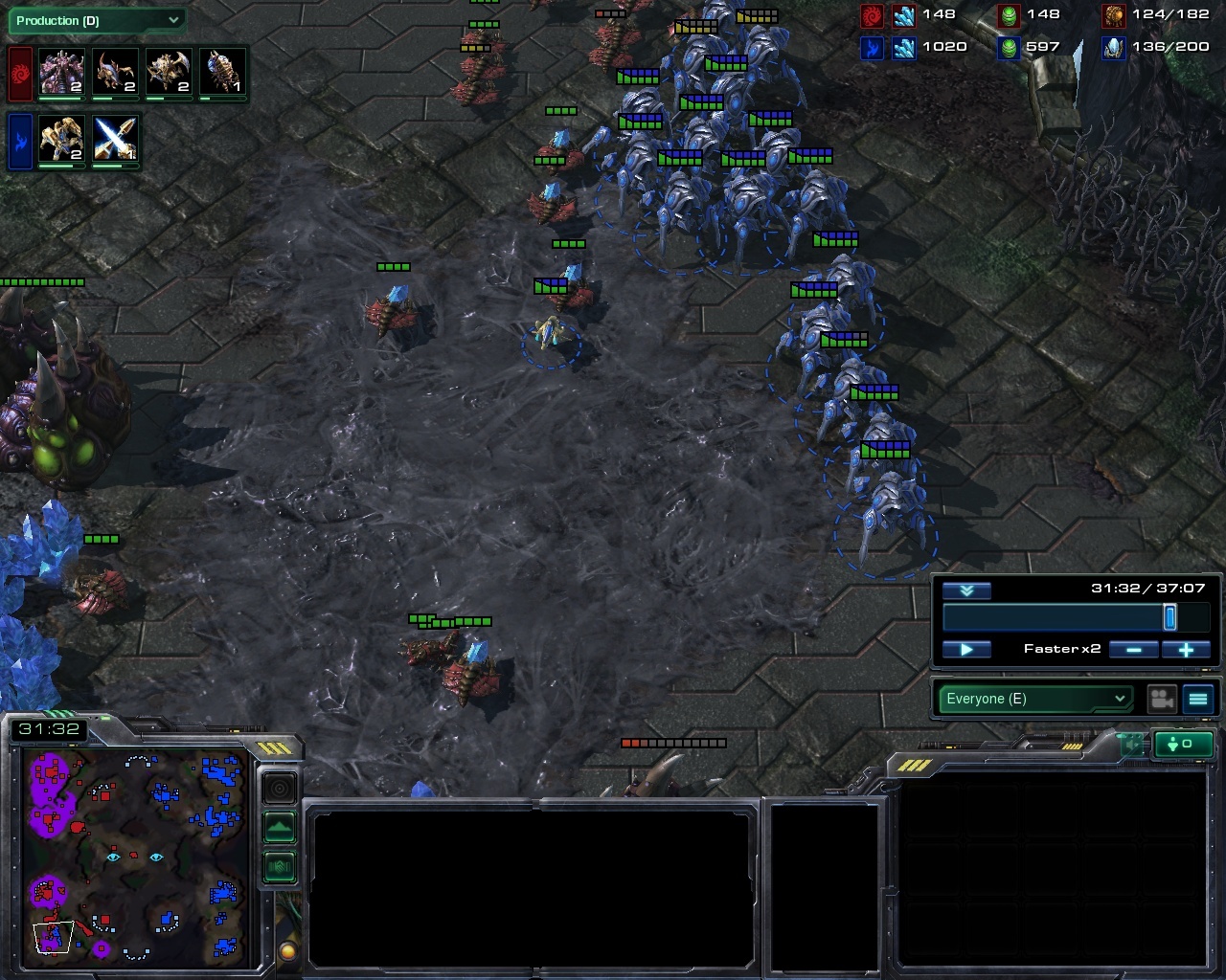The final battle (or at least the final that means a damn) ensues at 30:00 but by that time there is in practice no hope left for zerg. The engagement ends with a big army trade but a quick look at the economy tab is giving out the real picture - the protoss is mining three times more resources and has an unreachable advantage. He quickly restores the core of his army by morphing in a few archons and marches forth for the blazing victory.