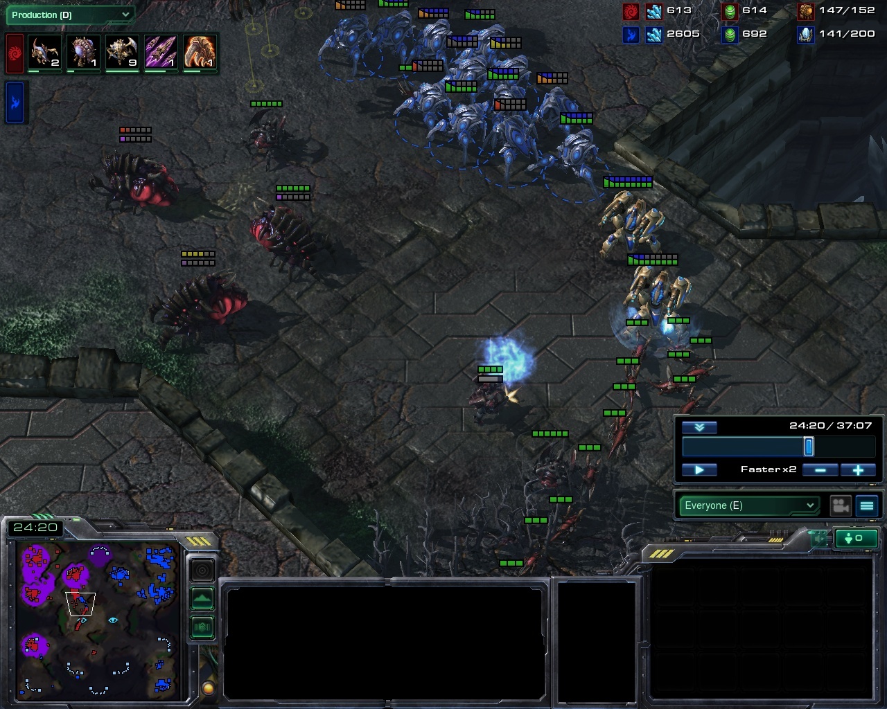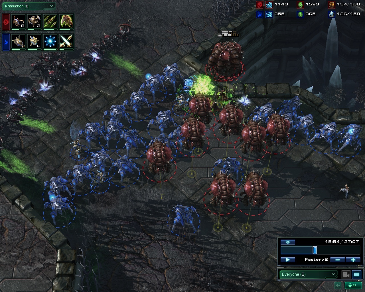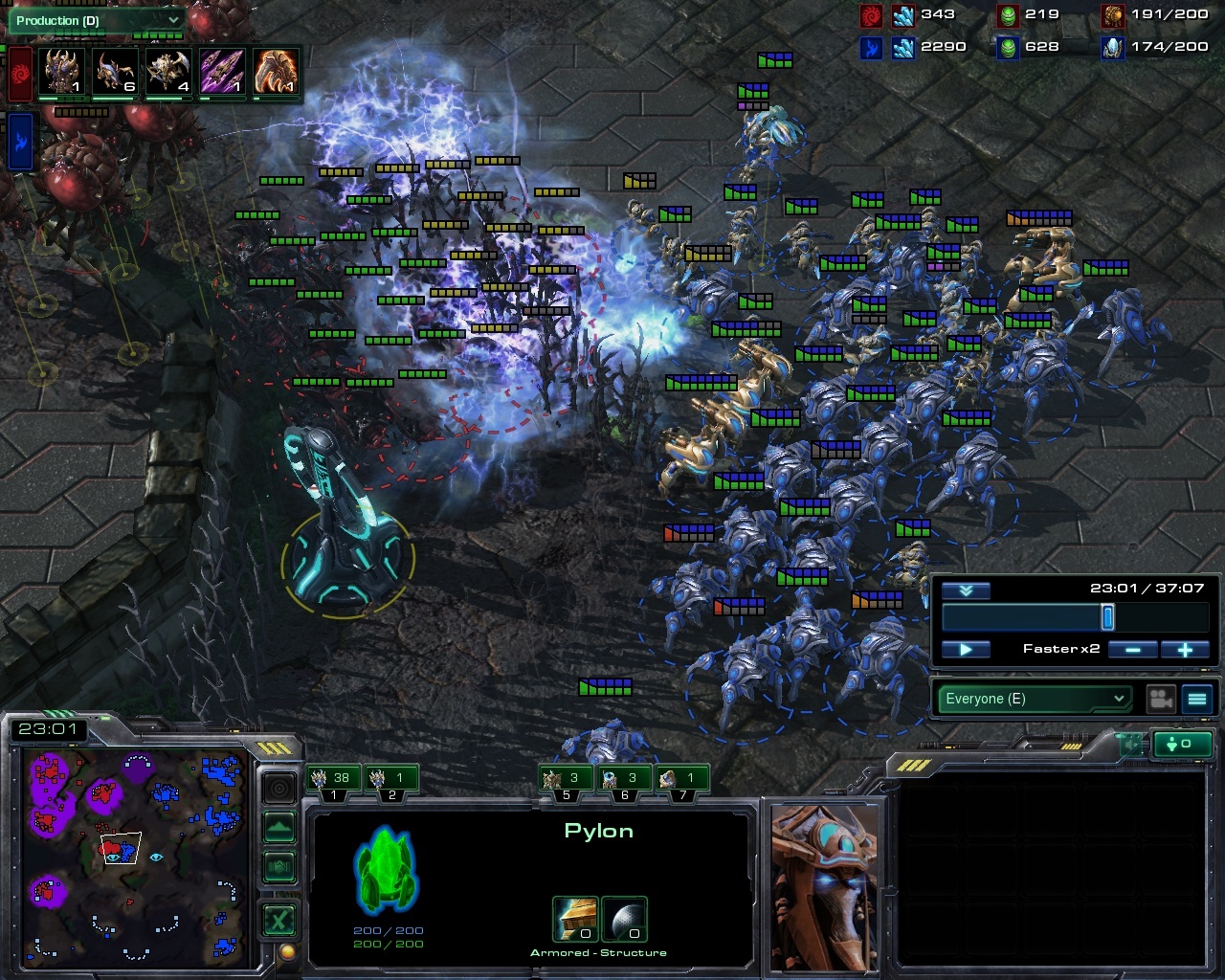 16:00 - Protoss wins a big victory thanks to blink, runs north to kill zerg's fourth