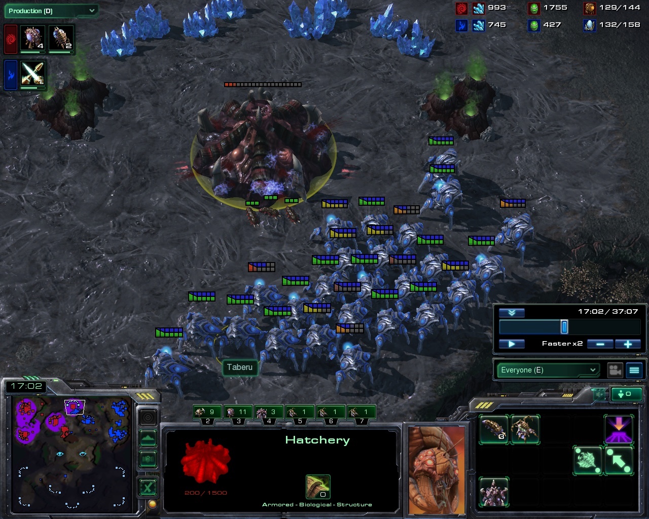 A second timing attack from the protoss comes around 16:00 as his blink is close to done. The two parties engage in a direct battle but blink finishes in just the right second and the zerg is forced to retreat way back to his natural. This creates an opening for a golden opportunity and Taberu seizes it, immediately swinging north to destroy Destiny's 12 o'clock. Few minutes later, Taberu starts teching to storm and grabs a hidden fourth at the bottom right.