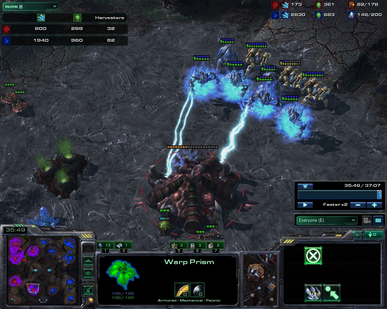 It is just around that time that Taberu makes the first steps to his shattering late-game harassments to come. A sneaky yet devious probe finds its way to the bottom left half of the map and places hidden warp-in pylons in close proximity to what will inevitably turn into zerg expansions. Furthermore, staying true to the principle that it's hard to find something small amidst a noisy ruckus, Taberu is constantly keeping the zerg occupied, tormenting him with a storm immortal army and denying him every piece of map control.