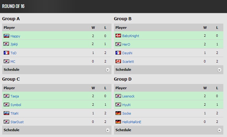After the foreign triumph in the first two groups, the Koreans returned to take the other half. Not allowing a single European to pass through, Taeja and Symbol trampled through Group C while Zerg duo Leenock and HyuN ruled in Group D over the Germans Socke and Heromarine.